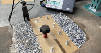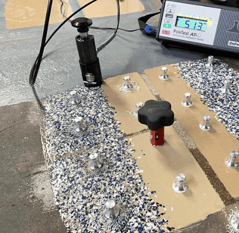 In this ground breaking test, metal dollies are adhered to a variety of substrates utilizing the most common epoxy and polyurea floor coating materials where the force required to pull them off can be measured.