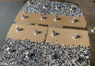 In the case of high solids epoxy, they consistently demonstrated pull off strengths that exceeded 900 psi and as you can see in the picture, the dollies pulled part of the concrete up with them as the substrate failed before the epoxy bond.