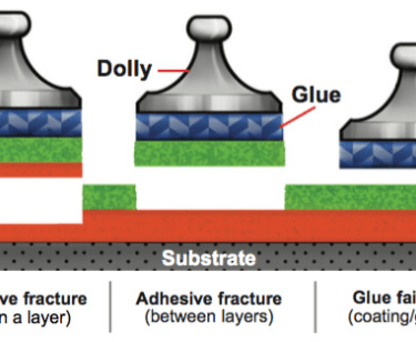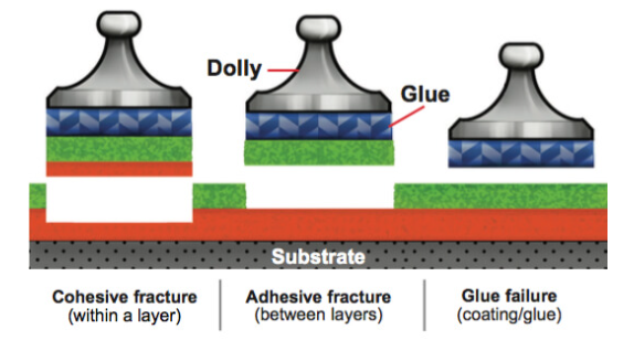 A key metric in these type of tests is where the point of failure occurs more so than the strength required to cause the failure. As you can see on the right, the failure point can be at the coating or glue, it can be between layers, or within a layer.