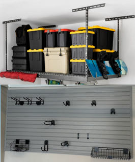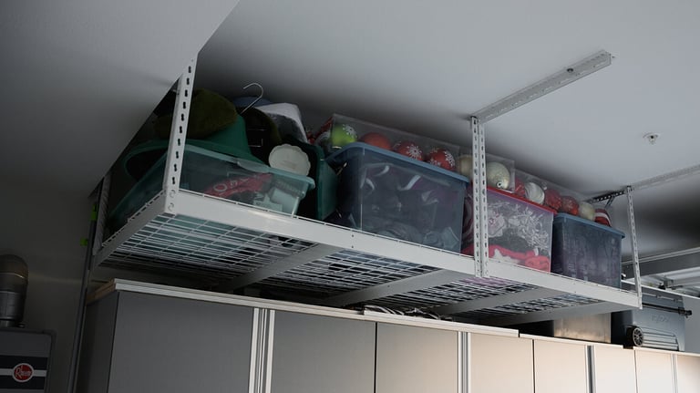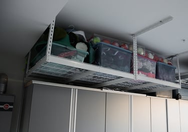 Overhead ceiling racks take full advantage of your garage's vertical space, offering a robust storage solution that keeps less frequently used items out of the way yet easily accessible, dramatically increasing the usability and organization of your garage.
